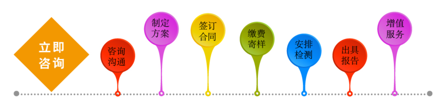 检测流程 1、电话咨询 2、邮寄样品或上门取样。 3、工程师报价 4、支付检测费用,开展实验。 5、完成实验,具检测报告。 6、邮寄检测报告,售后服务。