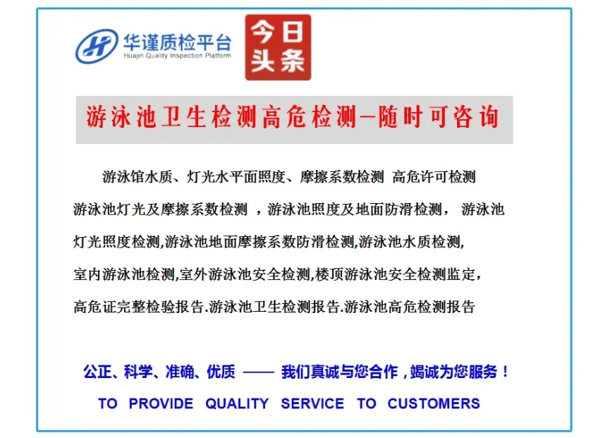 佛山市南庄镇游泳馆高危许可检测中灯光照度与摩擦系数检测单位的专业解析佛山市南庄镇游泳馆高危许可检测中灯光照度与摩擦系数检测单位的专业解析 华谨检测提供游泳场馆检测、攀岩场所检测、滑雪场馆检测、潜水场馆检测以及其他的场馆器材检测服务等高危险性场所安全性测试服务,一体化服务 供专业的质量解决方案。 本公司页面上不显示价格的原因是: 具体价格根据检测项目以及实际需求决定 游泳池水质状况直接关系到人体健康,池水不洁将对游泳者产生危害。游泳过程汗液及尿液排出和皮肤污垢溶入池水使池水受到污染,不洁水可引起游泳者咽炎、传染性软疣等传染性皮肤病、病毒性胃肠炎等暴发或流行。检测内容:菌落总数,余氯,尿素,浑浊度,PH,水温(持续、平均分散)检测标准:GB37488-2019游泳池水检测周期到样后7-10个工作日(可加急),根据样品及其检测项目/方法会有所变动,具体需咨询工程师。 依据JGJ 153-2016《体育场馆照明设计及检测标准》,游泳池水面水平照度需达到200lux以上,应急照明照度不低于50lux。检测单位采用经过计量校准的照度计,在距水面1.2米高度、按5米×5米网格布点测量,数据需符合《建筑照明设计标准》GB 50034-2013的一级照明要求。 (二)地面摩擦系数检测按照GB/T 22517.2-2008《体育场地使用要求及检验方法 第2部分:游泳场地》,采用摆式摩擦系数测定仪,在池边、更衣室、淋浴区等关键区域进行检测,干态摩擦系数应≥0.5,湿态摩擦系数应≥0.3。检测单位需记录不同区域的动态摩擦值,并与国家标准进行比对分析。 送样要求:2公斤,检测周期:3-5个工作日,收费标准:电议 华谨质检平台是一家的第三方检测公司,提供广泛的服务范围。如果您有任何检测需求或疑问,欢迎随时联系我们。热门检测项目服务:公共卫生检测,职业卫生检测,土壤检测,环境检测,噪音检测,箱包检测,纺织品检测,皮革制品检测,食品安全检测,粮食检测,肉制品检测,蜂蜜卫生标准检测, 职业卫生检测,化妆品检测,消费品检测 ,不锈钢管检测,金属制品理化分析,水质检测,矿石成分分析,石英石检测,岩石硬度检测,萤石氟化钙检测,等 您可以通过以下方式与我们取得联系: 作者小鹏鹏 温馨提示: 工作日工作时间:周一至周五 上午:08:30-12:00 - 下午:13:30-17:30。 报告办理流程: 01、提交委托咨询 02、检测方案制定 03、支付检测费用 04、邮寄检测样品 05、出具检测报告