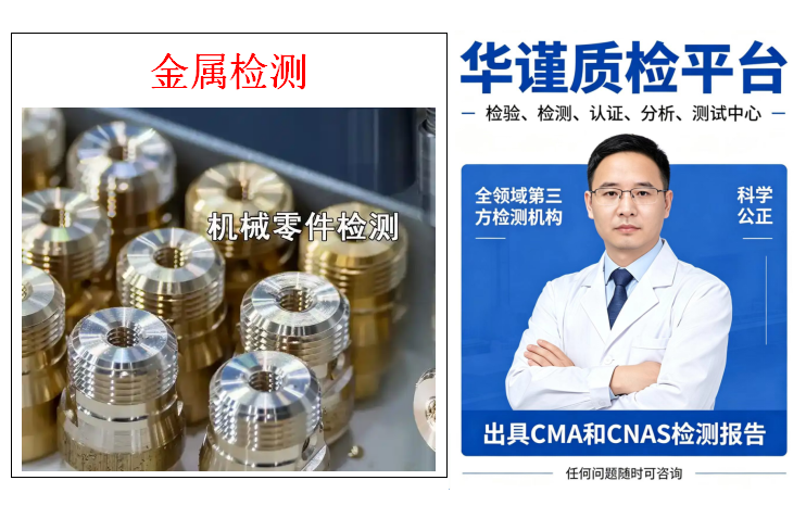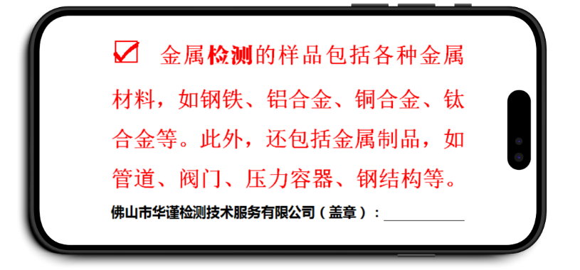 佛山市金属材料理化检测,不锈钢成分光谱分析机构时间:2026-04-27 佛山市金属材料理化检测,不锈钢成分光谱分析机构 报告类型/委托类型/联系方式: 质检认证平台&联系方式:132-1119-2174 钟工,网址:http://www.gdzyts.com 佛山市华谨检测技术服务有限公司 金属检测的样品包括各种金属材料,如钢铁、铝合金、铜合金、钛合金等。此外,还包括金属制品,如管道、阀门、压力容器、钢结构等。 华谨质检平台,检验、检测、认证、分析、测试中心 检测项目 2、金相分析:金相组织、晶间腐蚀、脱碳层深度、渗碳层深度、低倍组织、高倍显微镜组织、晶粒度及显微评级、高温金相组织等; 2、防火性能:氧指数、水平燃烧、烟密度、烟毒指数、内饰件燃烧、防火等级等;